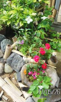真っ赤なばら白いハナミスキ石水生庭園