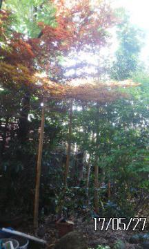 晴れ 日差しで紅葉が赤かく 生の後ろ庭 大きな縁起物金明竹三本あり大屋根越えも 太い これから後ろ庭に金明竹が増えるのでは 日当たりがいい庭