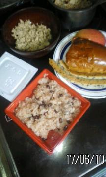 楽しい夕食カツオ醤油煮パン赤飯果物