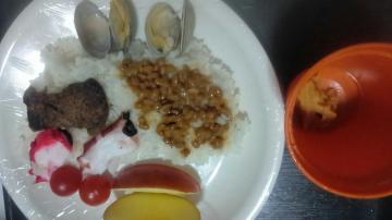 幸せ朝食◎上ステーキ冷凍解凍酢・たこ・大粒あさりたこ・高価玉子(1個数100円)納豆トマト(^_^)vリンゴ子のプレゼント宅配◎コシヒカリ白ご飯半額買減塩味噌汁