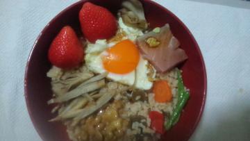幸せ**朝食◎刺身天然ぶり半額買ゴボ・ウインゲン・マイタケ○玉子納豆(^_^)vいちご子の宅配○信州無添加減塩味噌汁 ○玄米①出し昆布②カツオ人参ピーマン唐辛子ネギ ①②子の小遣い