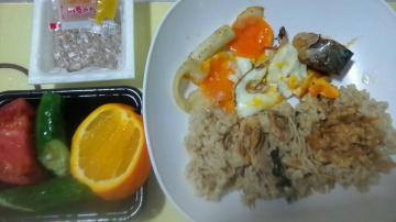 生の料理朝食◎サバ缶詰(子の宅配)玉子他◎生の炊きライス美味しい◎玄米・ガスエビ・小松菜・丸金エノキ・唐辛子・タマネギ・生姜・モヤシ・ごぼうライス美味しい◎オレンジ