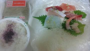 ☺美味しい昼食刺身石川県ふっくらレンジライス赤シソ とろろ昆布汁✌✊