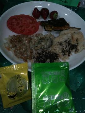 ☺元気可朝食☺サバカキ貝能登(造血1)・色付け(化学使用なし)◎トマト(造血)○ブロッコリー◎納豆◎玉ねぎ・トマト◎玄米 赤シソ粉・玄米チョイパン☺子の宅配 味噌汁の具ねぎ・イチゴ
