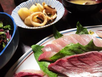 フクラギ刺身、イカジャが、ほうれん草サラダ、味噌汁はフクラギのざんです。