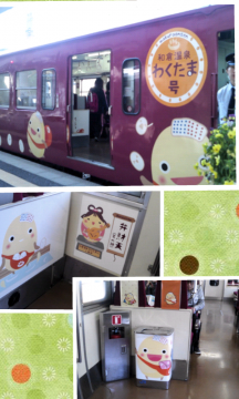 七尾駅からはJRに乗り換えです。ラッピング列車は、いろは坂から、和倉温泉のゆるキャラわくたま君に。流石、
