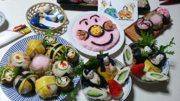 アンパンマン寿司に男雛に女雛、手まり寿司。お刺身はおじちゃんとこからゲットなり♪