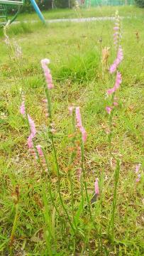 ゴミ出しの公園で、薄曇りの中で、ピンクのネジネジさんがあちこち処狭しと咲いている♪うふっ