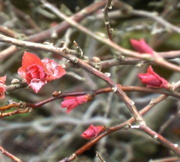 マジックカーペットの新緑の赤が雨粒を受けてました。