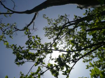 エゴノキ、花芽があるか?カメラを持って[イナバウワー]スタイルで撮影した一枚。