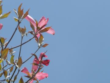 ハナミズキの背景に力を尽くす、聡明なやわい青空。