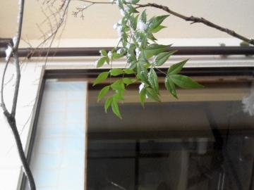 南天の葉に一休みの、淡雪。