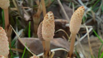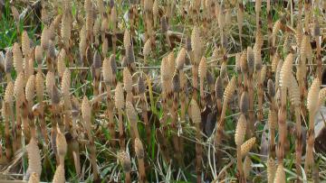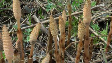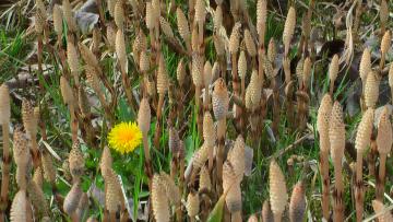 おっ 掃き溜めに鶴? じゃなくて、ツクシの中にたんぽぽ一輪。
