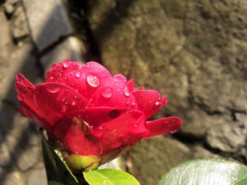 朝露に輝く山茶花一輪。きれい。