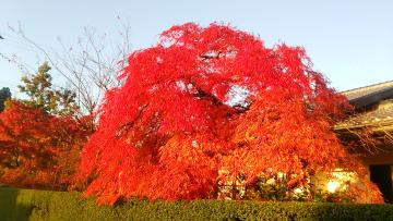 週の始まり、爽やかな朝陽に、紅葉真っ盛りのタムケは、青空バックに真っ赤っか♪右奥空にはお月さまが微笑んでます。